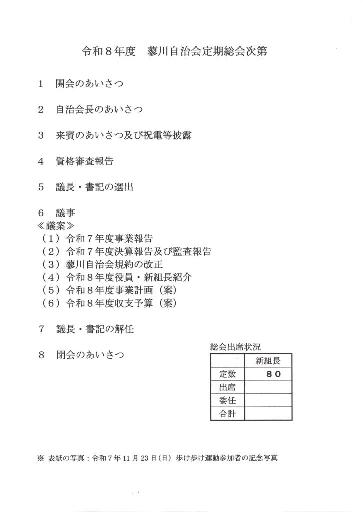 EPSON MFP image EPSON MFP image 令和8年4月5日(日) 午前10時 北の台コミュニティプラザにて定期総会を開催しました。来賓並びに新年度組長に参会頂き、滞りなく実施することができました。ありがとうございました。本年度も蓼川自治会をよろしくお願いいたします。 地域情報