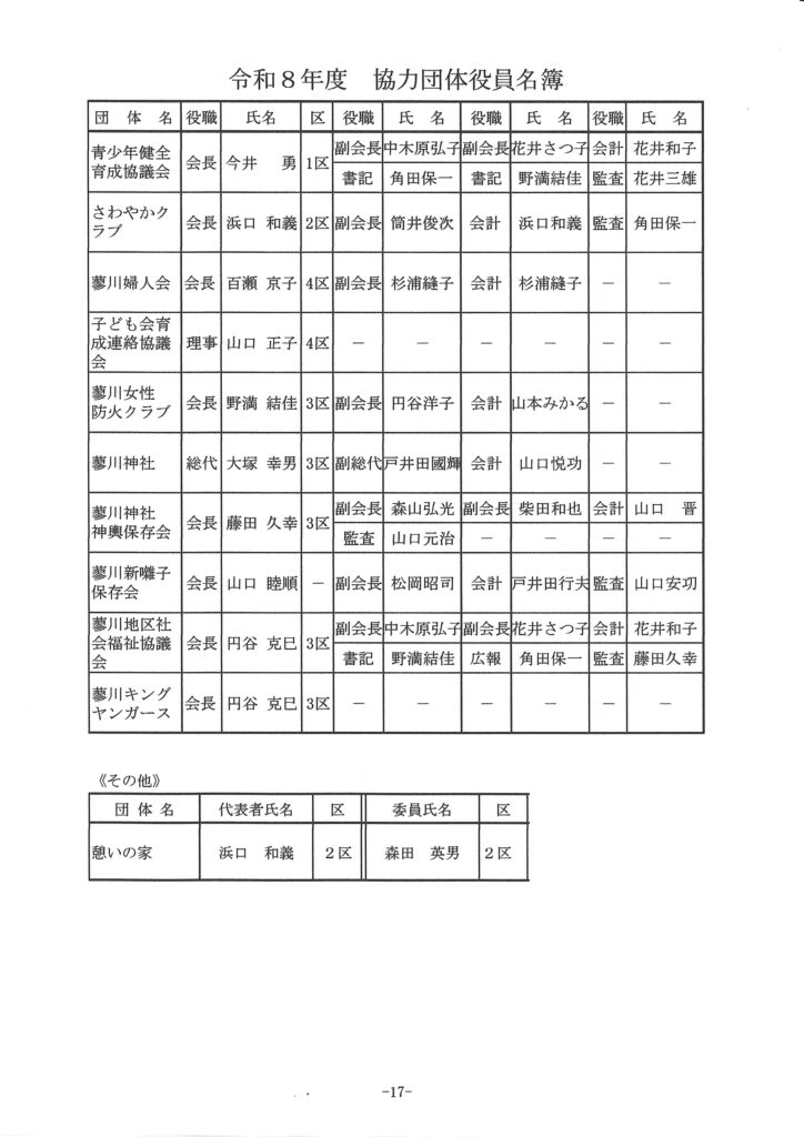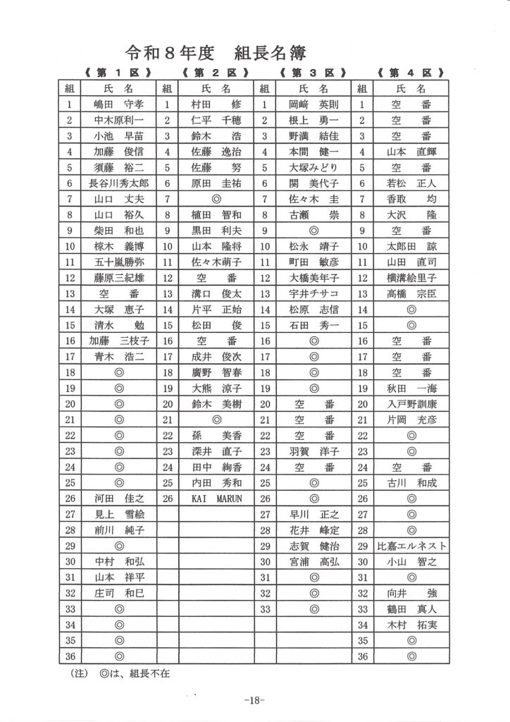 3区長:高橋重夫 会計:今井勇 2区長:森山弘光 4区長:鶴田真人 副会長:中村徳光